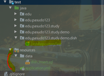 - @Sql 애노테이션 스프링 4.1 때부터 추가된 것인데, 클래스 레벨 또는 메소드 레벨에 붙일 수 있다. 지정한 스크립트를 직접적으로 수행시킨다. classpath 는 기본적으로 test/resources 위치를 잡고있으니, 그 하위 경로인 data/dish_insert.sql 을 추가해주었다. 이렇게 하면 테스트 코드 실행이전에 sql 구문부터 수행해서 위의 메소드에 대한 테스트를 성공한다.