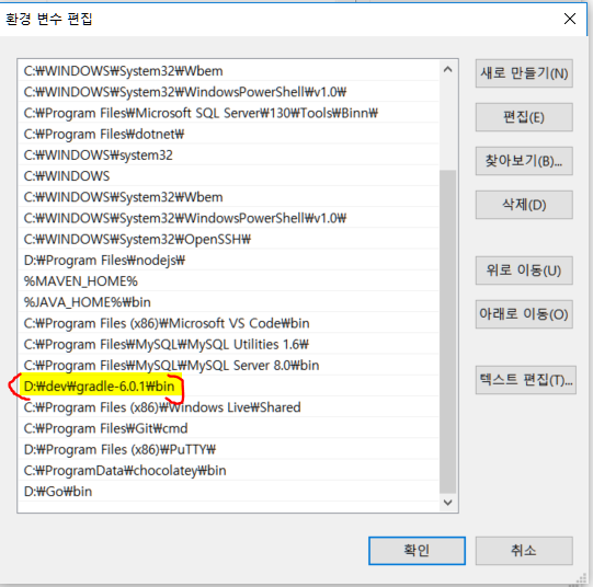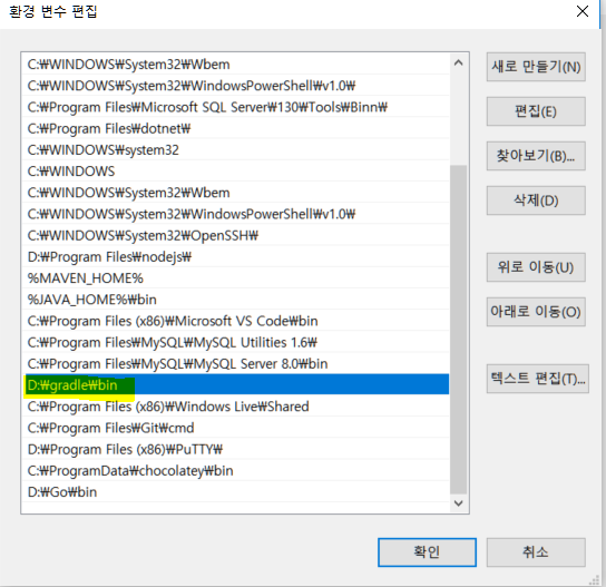 이전 버전의 gradle/bin 이 환경변수로 등록되어있는데 저 부분을 변경해준다.