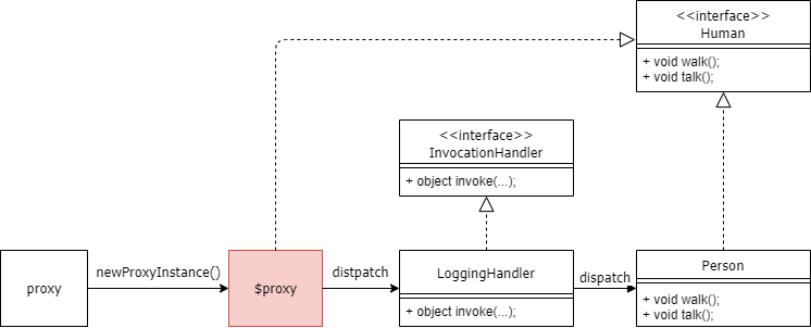 다이내믹 프록시 클래스는 (이하 프록시 클래스라 칭한다.) 생성될 때, 런타임에 동적으로 인터페이스를 구현한다. 프록시 인터페이스는 프록시 클래스에 의해 구현되는 인터페이스이다. 프록시 인스턴스는 프록시 클래스에 대한 인스턴스이다.