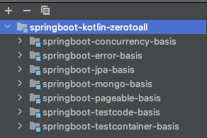 2. gradle tab 에서 최상위 모듈 하위에 서브모듈이 제대로 잡혀 있는지. 간혹 가다 springboot-kotlin-zerotoall 과 함께 같은 레벨에서 springboot-testcontainer-basis 로 gradle project 가 같이 잡히는 경우가 있다. 그런 경우 하위모듈이 상위로 잡힌 것을 없애주어야 한다.
