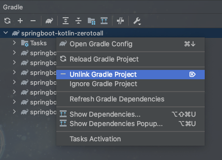 3. 의 경우가 나는 문제였기 때문에 하위 모듈로 잡힌 gradle project 를 없애주어야 했다. (이거 어떻게 없애지.. 생각이 들다가 문득 gradle tab 을 열었다.) 아래의 unlink gradle project 버튼을 누르면, 현재 Gradle project 를 해제하게 되고, 상위 build.gradle.kts 파일 내에서 gradle configuration load 를 클릭하면 정상적으로 디펜던시 설정 및 서브모듈이 불러오는 것으로 해결할 수 있었다.