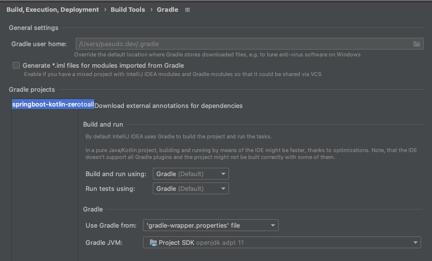 3. preference(mac 단축키 : command + ,) 다이얼로그에서 gradle 메뉴로 들어가서 gradle-wrapper.properties 를 제대로 사용하는지. 하단의 사진을 살피면, Gradle Project 라고 되어있고 거기 프로젝트 명이 나의 경우에는 springboot-testcontainer-basis 로 잡혀있었다. 그러니깐 gradle project 가 하위 모듈로 잡힌 상태에서 Use Gradle from 에 gradle-wrapper 파일을 찾으려니 없어서 에러가 난거겠군 이라는 약간의 짐작이 들었다. (지금은 해결을 했기 때문에 정상적으로 springboot-kotlin-zerotoall 이라고 잡힌 상태 !)