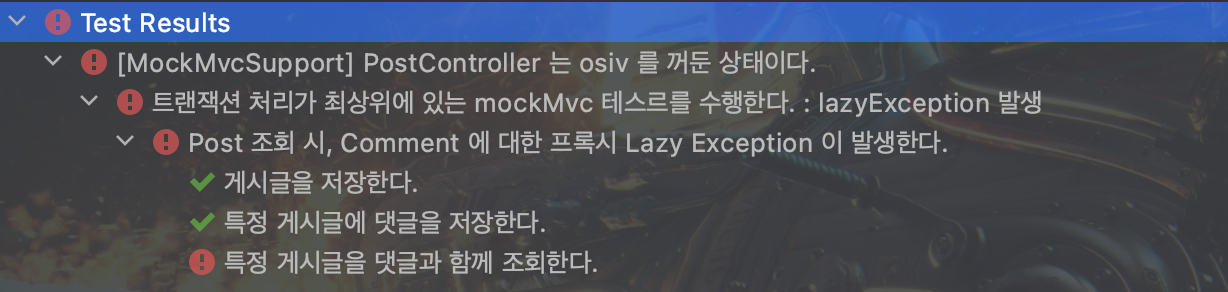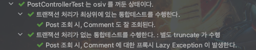코드를 보면, 마지막 DynamicTest 에서 원래는 실패가 떨어지는게 맞다. osiv 를 꺼두고 테스트하니깐. 하지만 @MockMvcSupport 에 @Transactional 이 같이 붙어있기 때문에 테스트 성공이 뜬다. @Transactional 을 제거하면 lazyException 이 뜨는 것을 확인할 수 있다.